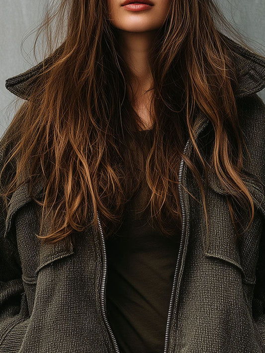 Cozy Stand Collar Olive Green Textured Knit Zip-Up Bomber Jacket