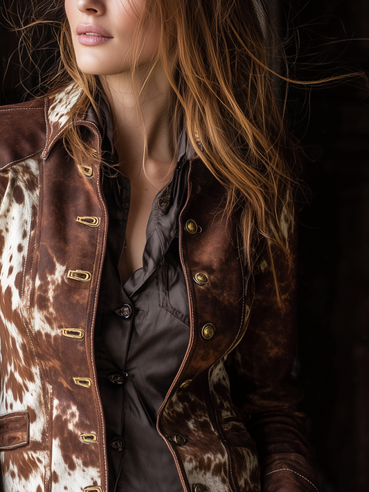 Vintage Button Cow Skin Printed Faux Suede Jacket