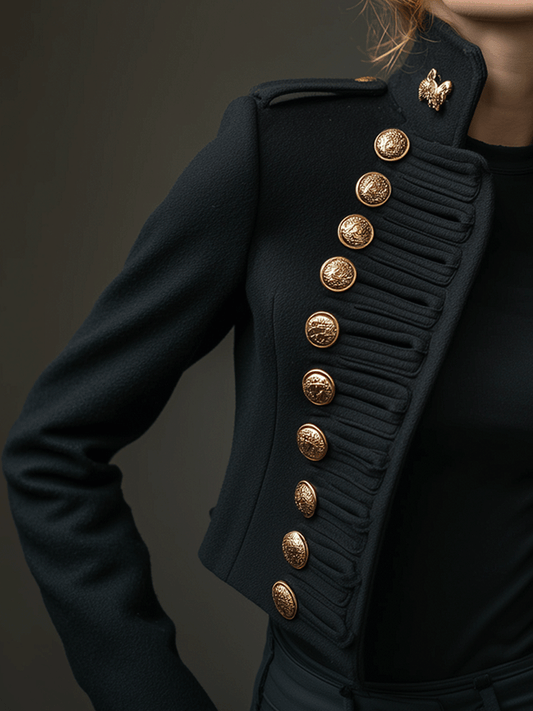Vintage-Inspired Black Double Rows Of Gold Buttons Short Fit Jacket