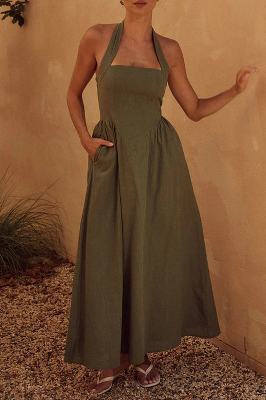 Yolaina® | Sexy plain sleeveless dresses with pocket pleats and halterneck