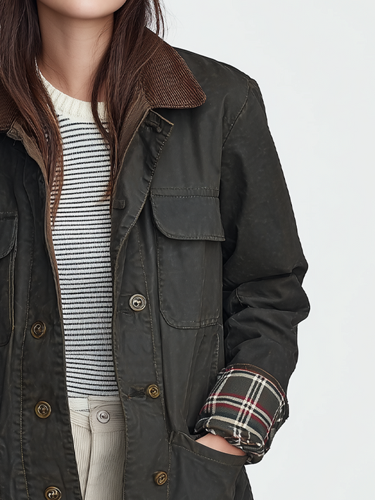 Retro Contrast Collar Plaid Cuffs Barn Jacket