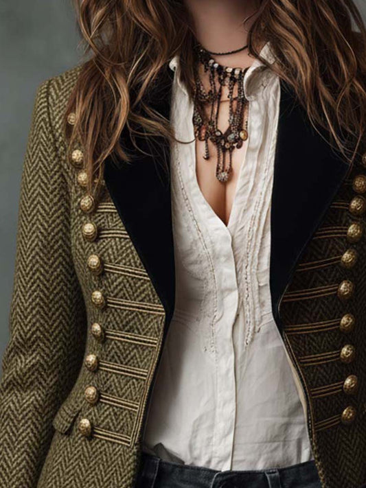 Olive Herringbone Military Blazer With Velvet Trim