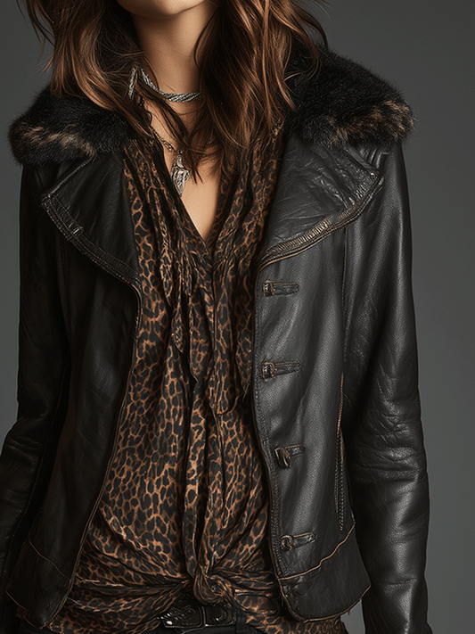 Retro Chic Black Leather Faux Fur Trim Jacket