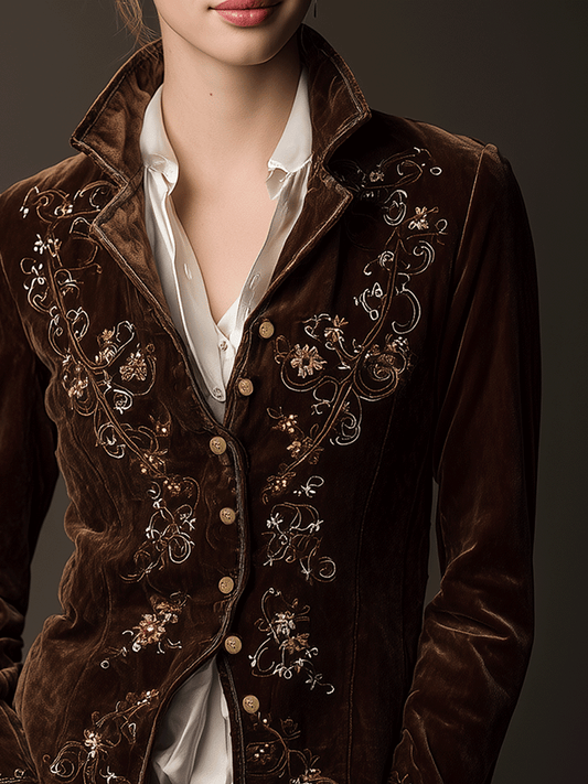 Vintage Contrast Trim Embroidered Cuffs Velvet Jacket