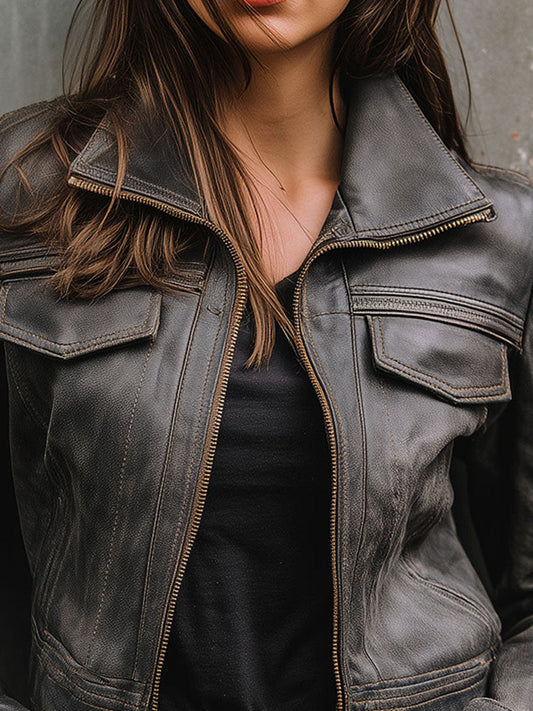 Vintage Eco Leather Moto Biker Cropped Jacket With Front Pockets