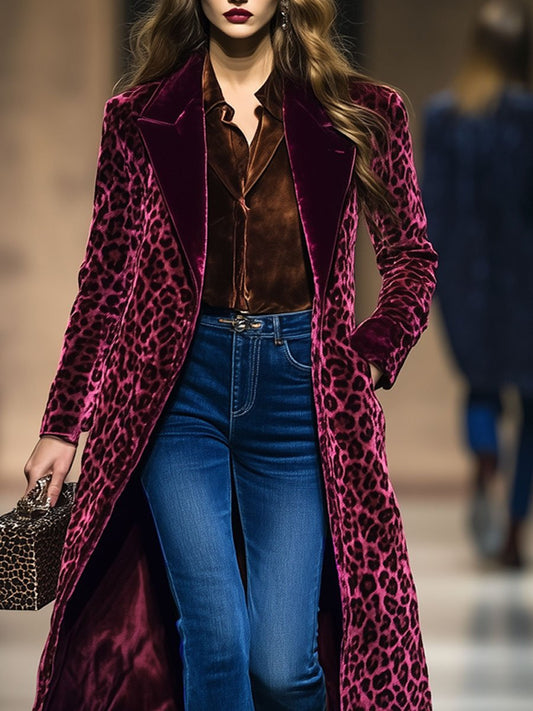 Casual Loose Vintage Velvet Leopard Print Colorblock Lapel Coat