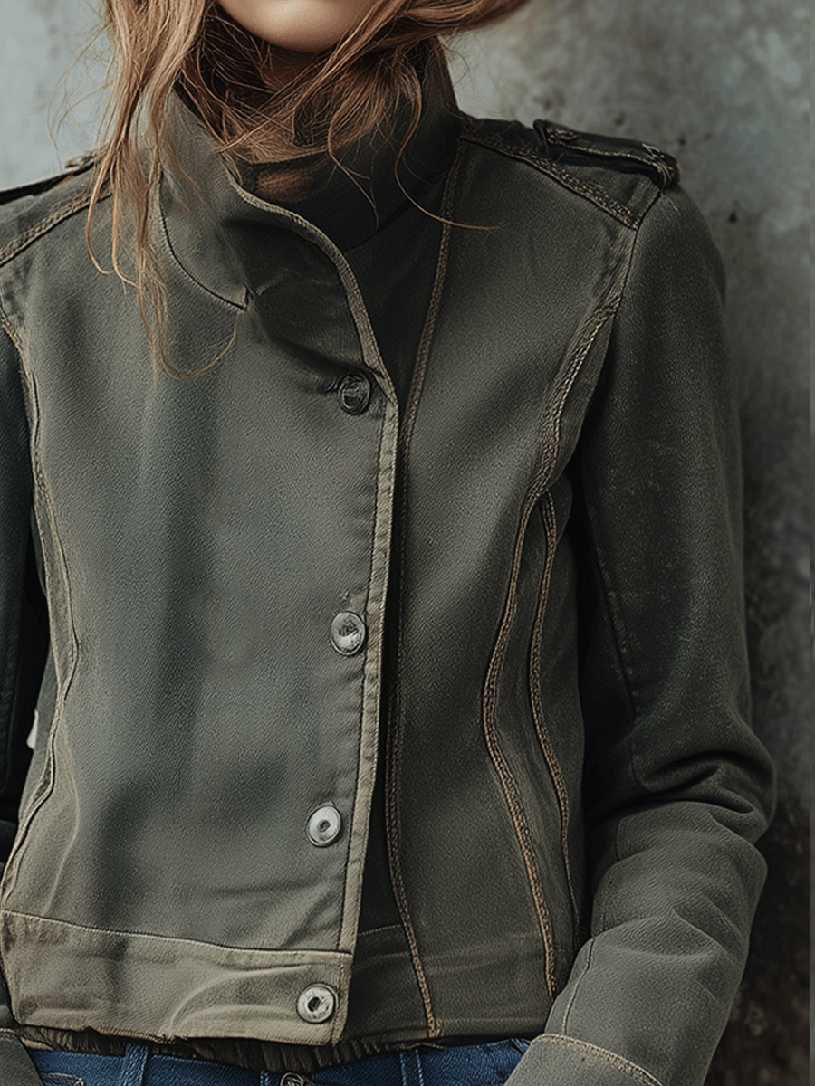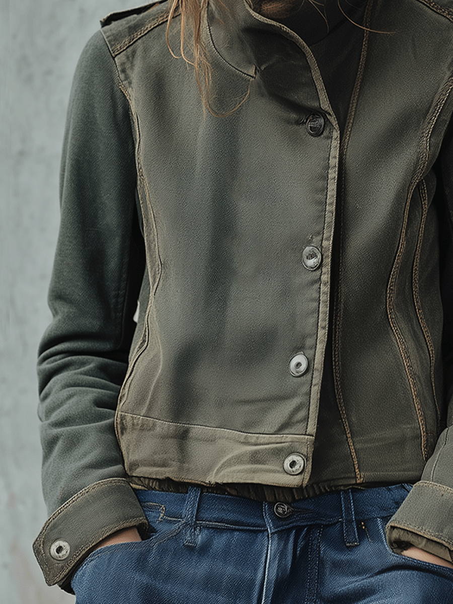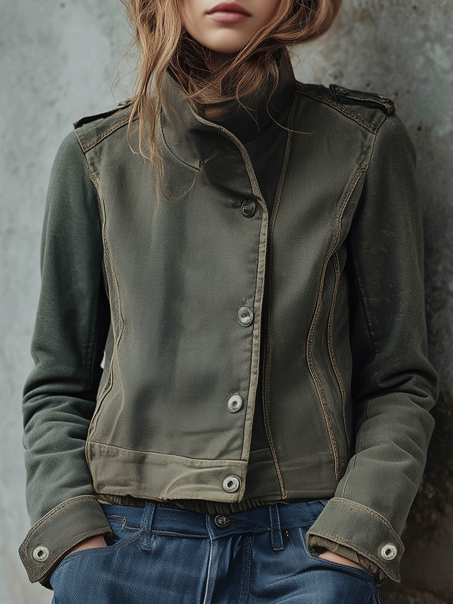 Casual Loose Olive Green Military Cropped...