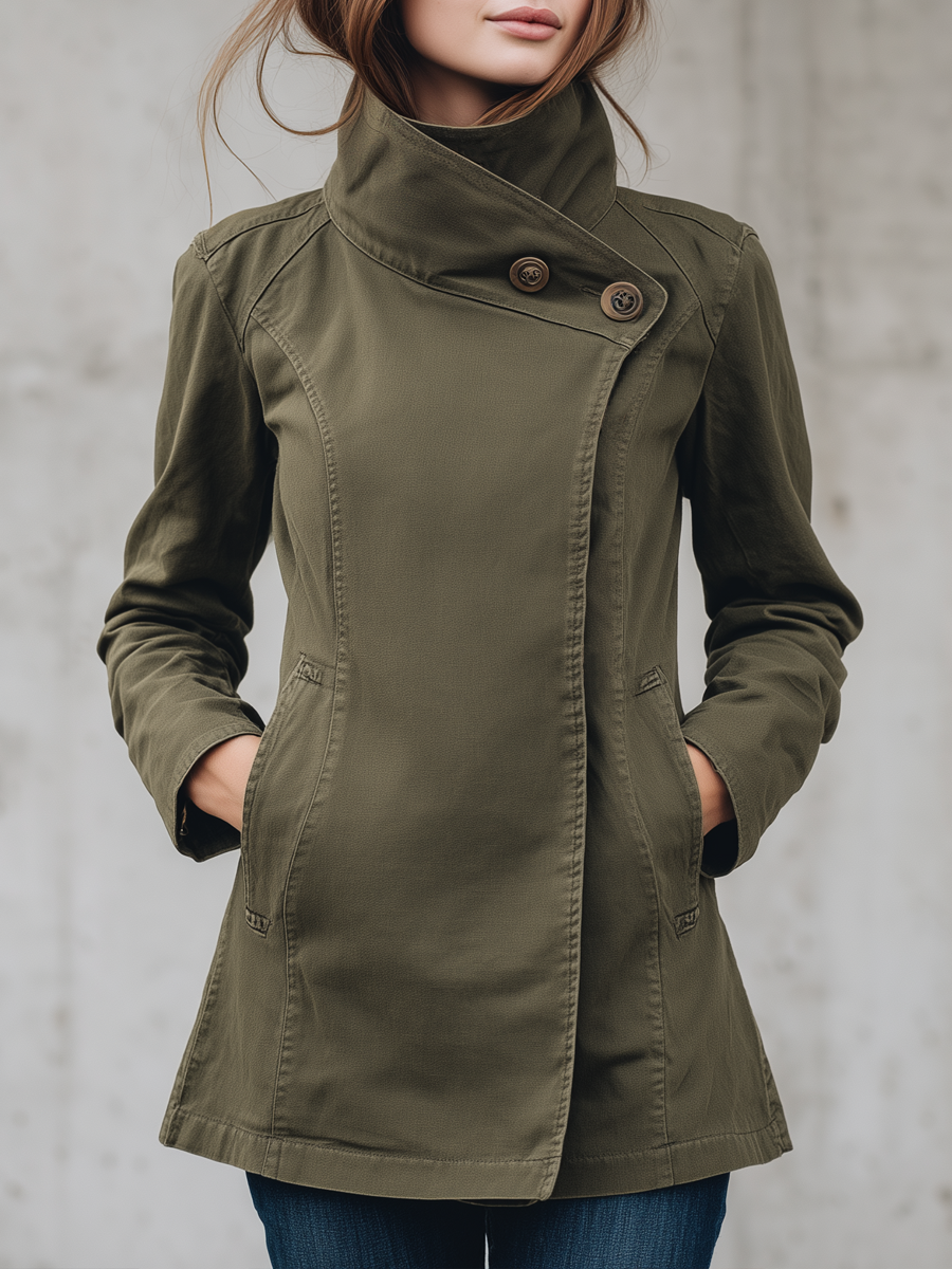 Olive Green High Neck Asymmetric Button...