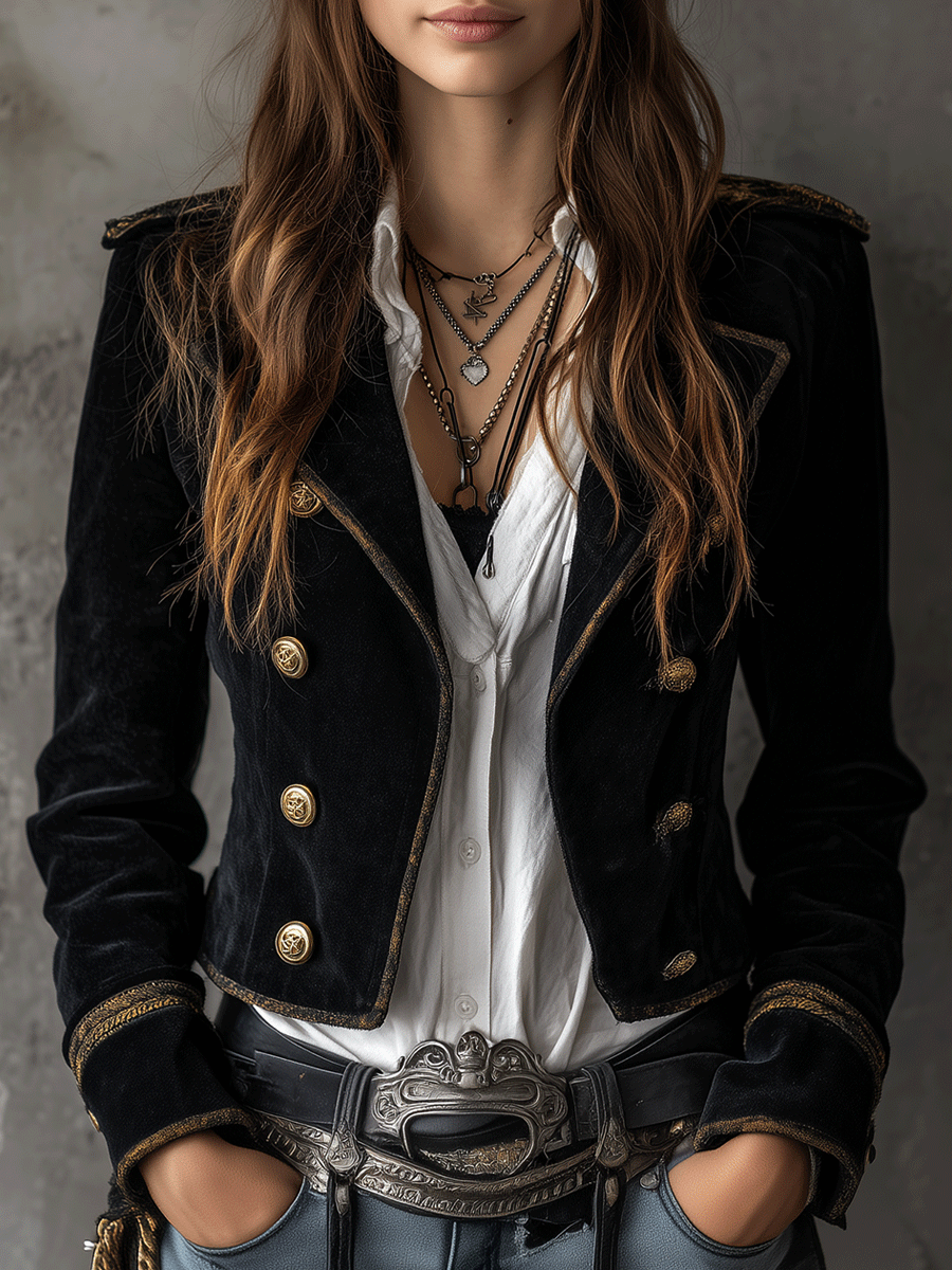 Retro Black Velvet Military Gold Button Detailing Blazer