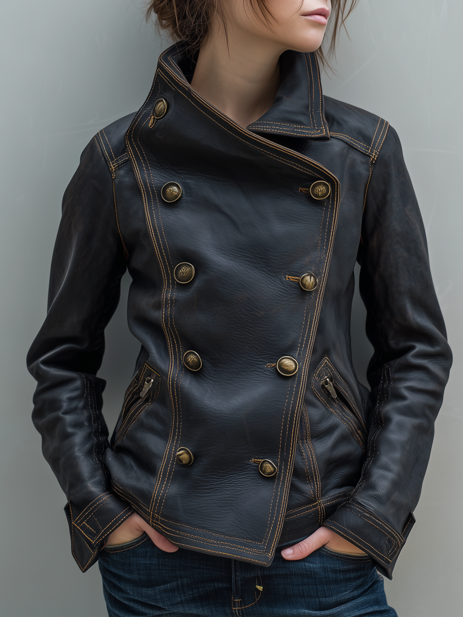 Retro Double-breasted Contrast Stitching Eco-friendly Leather...